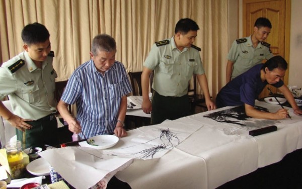 近年来,武警随州支队大力营造“创建文化警营,培育知识官兵”的良好氛围,采取“走出去,请进来”等方法与地方开展警地共建共育活动。图为省内知名书画家来到支队为官兵传授书画技艺。(本报记者 杨闻名 通讯员 汪波 摄)