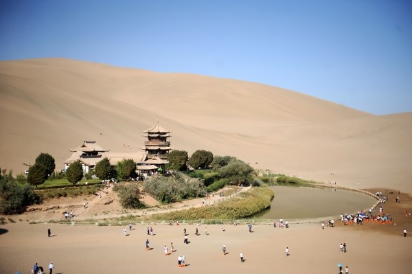 8月29日,游客在月牙泉边游览。入秋以来,敦煌天气凉爽,游客人数增加,据敦煌市政府相关人员介绍,连日来敦煌市每日接待游客愈4000人。 (新华社发)