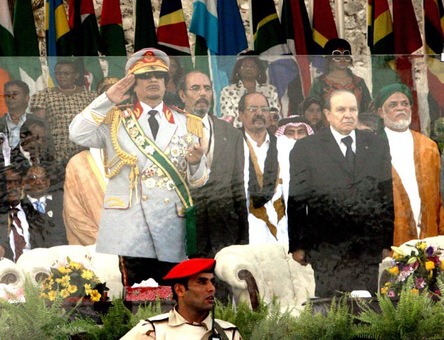 9月1日,在利比亚首都的黎波里,利比亚领导人卡扎菲(前左)与来宾一同观看利比亚革命40周年阅兵仪式。当日是利比亚革命40周年纪念日。 (新华社发)