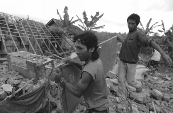 九月三日,在印度尼西亚西爪哇省,两名青年人在废墟上搬运物品。九月二日,印尼西爪哇省附近印度洋海域发生里氏7.3级地震。地震发生后,受灾群众迅速清理倒塌的房屋,展开自救。(新华社发)