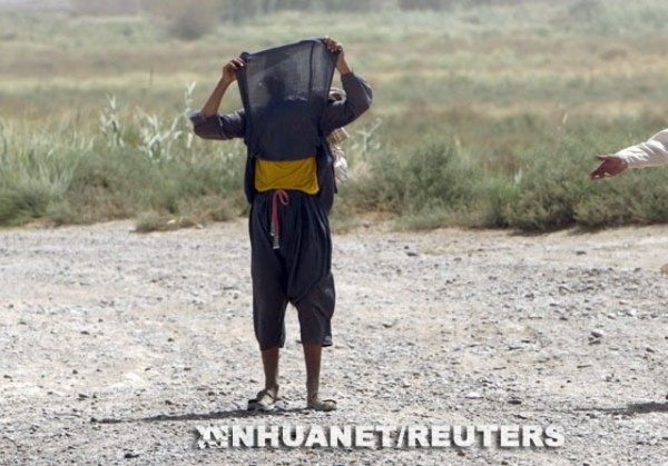 9月6日,在阿富汗南部的赫尔曼德省,一名当地男子掀起衣服,向准备搜身的美军士兵表明自己身上没有携带爆炸物。 (新华社发)