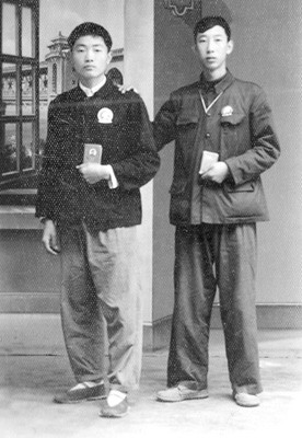 ①1970年,张光成(右)与朋友一起,胸前别着毛主席纪念章,手里拿着一本《毛主席语录》,表情严肃。
