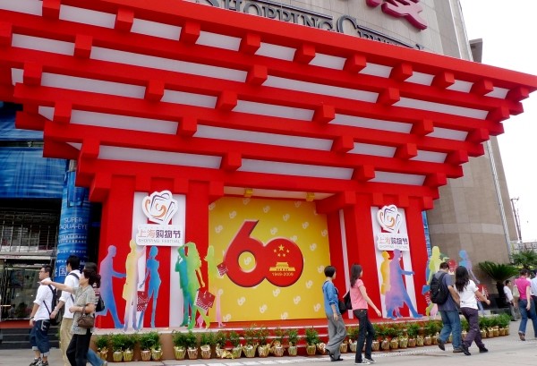 9月18日,行人走过上海徐家汇商圈的“迎世博,庆国庆”主题置景。近日,上海街头出现了各种以庆祝新中国成立60周年为主题的置景,喜迎即将来临的国庆节。 (新华社发)