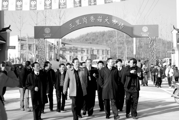 ▲2008年,时任湖北省委常委、副省长汤涛(前右二),市委书记马清明(前右三)及市有关领导考察随州香菇大市场。