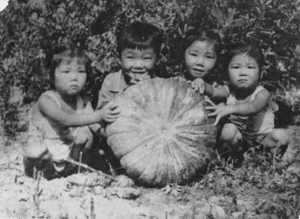 ④1959年,兄妹四人在父亲亲手栽种的大南瓜前留影。