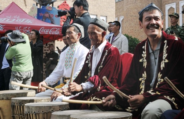 9月21日,鼓手们在二道桥大巴扎演奏传统节日音乐。当日是穆斯林的传统节日——开斋节(肉孜节),新疆乌鲁木齐市的穆斯林群众在清真寺做完礼拜后,来到二道桥大巴扎门前载歌载舞,欢度开斋节。 (新华社发)