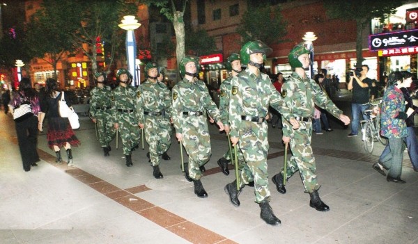 9月23日,武警随州支队执勤小组在城区解放路巡逻。据悉,该支队派出20多名官兵与公安机关紧密配合,组成多个巡逻小组,日夜巡逻在随州、广水的繁华场所、主要路口和重要目标周围,疏导交通、加强巡控,以保障国庆期间治安和安全。 (本报记者 杨闻名 通讯员 汪波摄)