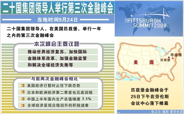 与二十国集团此前举行华盛顿和伦敦金融峰会时充满危机气氛不同,目前的国际经济金融形势已经大大改善:美国经济已暂时止住下跌态势;日本和欧洲经济第二季度也见底回稳;特别是中国经济在全球主要经济体中率先反弹,上半年国内生产总值增速达到7.1%,有力地促进了全球经济呈现企稳回升的积极迹象。