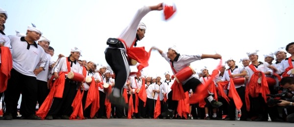 9月25日,安塞千人腰鼓队队员正在表演。当日,庆祝中华人民共和国成立60周年活动新闻中心邀请中外媒体记者,来到位于北京市郊的安塞腰鼓方阵训练基地采访。来自革命老区延安的安塞千人腰鼓队,是参加国庆群众游行的唯一一支京外表演队伍,9成以上的队员都是普通农民。10月1日他们将在天安门城楼前舞起豪迈的安塞腰鼓。