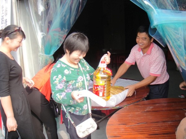 洪磷公司老厂生活区危旧房改造建设正有条不紊进行着。23日,拆迁指挥部为146户拆迁户每家送上一壶油和一袋米,和谐拆迁赢得了拆迁户的信赖和支持。 (王 松摄)