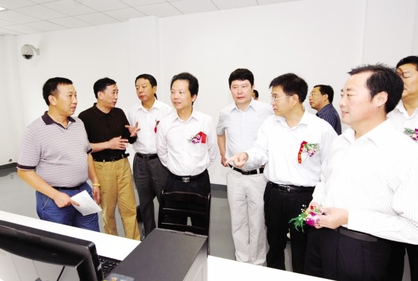 市长刘晓鸣(左四),市领导何光中(左六)、谭志勇(右一)等参观神农变电站主控室。