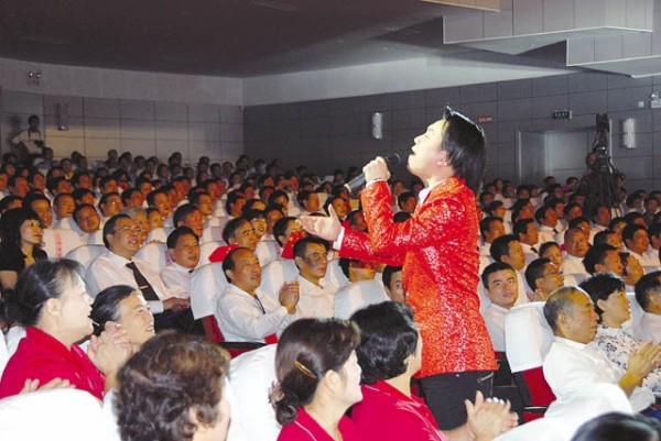 9月27日,曾都区在神农大剧院举行大型歌会活动,区“四大家”领导与数百名干部群众一起激情高唱,歌颂新中国60华诞。(本报记者 唐天才 通讯员 李一勤摄)