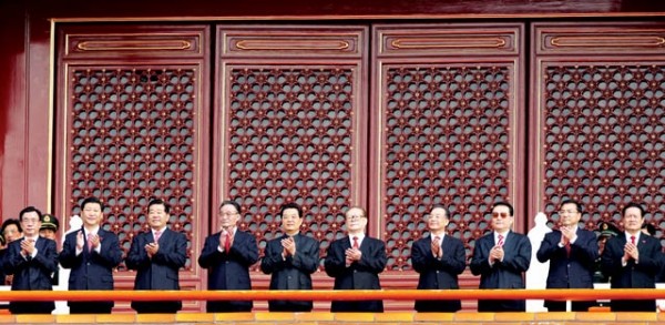 10月1日,首都各界庆祝中华人民共和国成立60周年大会在北京天安门广场隆重举行。党和国家领导人胡锦涛、江泽民、吴邦国、温家宝、贾庆林、李长春、习近平、李克强、贺国强、周永康出席大会。 (新华社发)