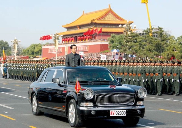 胡锦涛主席乘坐国产红旗牌检阅车,驶出天安门,通过金水桥,驶上长安街。在阅兵总指挥、北京军区司令员房峰辉的陪同下,胡锦涛主席开始检阅受阅部队。