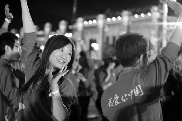 下图为参加联欢的大学生在晚会上跳集体舞。