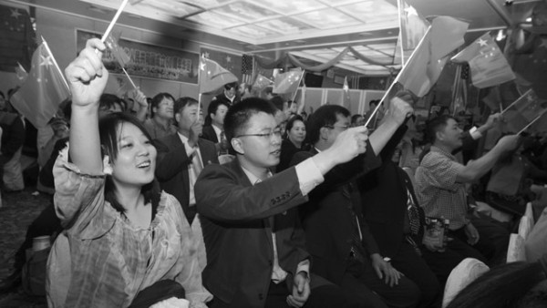 9月30日晚,在美国纽约,华侨华人挥舞国旗通过电视直播观看国庆阅兵式。当日,纽约众多华侨华人欢聚一堂,观看国庆阅兵式电视直播。 (新华社发)