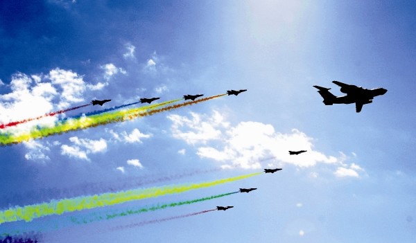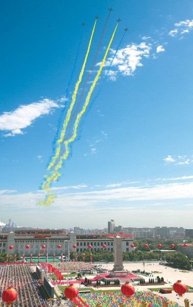 12个空中梯队共151架飞机。首次亮相的空警-2000预警机、歼-10、歼-11等新型战机,同样成为备受瞩目的焦点。空中梯队以“米秒不差”的精准飞行和楔队队形、“品”字形、三角形等各种队形飞过天安门广场上空。引人注目的是,作战飞机全部挂弹受阅。多型空空、空地导弹随着战机首次公开亮相。