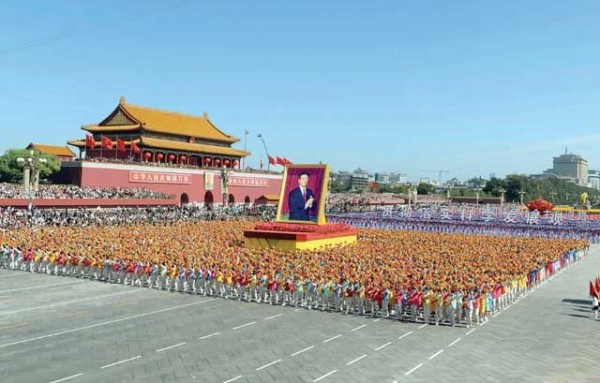 群众簇拥着巨幅胡锦涛画像经过天安门广场