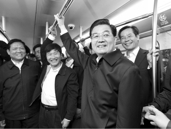 十月七日,中共中央总书记、国家主席、中央军委主席胡锦涛考察国庆期间北京安保、交通、旅游工作。这是胡锦涛乘坐地铁四号线,实地了解北京市轨道交通建设和运营情况。(新华社发)