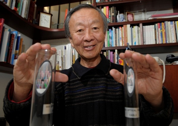 10月8日,刚刚获得诺贝尔物理学奖的华裔科学家高锟在美国加利福尼亚州圣克拉拉县芒廷维尤的家中展示光纤。瑞典皇家科学院宣布,将2009年诺贝尔物理学奖授予英国华裔科学家高锟以及两位美国科学家。高锟获奖,是因为他在“有关光在纤维中的传输以用于光学通信方面”做出了突破性成就。 (新华社发)