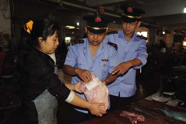 如何让老百姓知道牛肉中注了水,曾都区工商局西城分局工作人员日前在蓝天农贸市场检查中,现场给消费者支招:将纸巾贴在生牛肉上,若迅速湿透并无粘连现象,则为注水牛肉。(本报记者 李文军 通讯员 陈勇 摄)