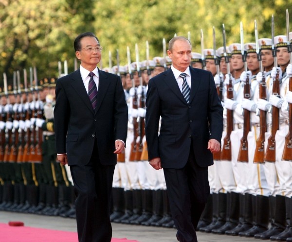 温家宝总理为到访的普京总理举行欢迎仪式。 (新华社发)