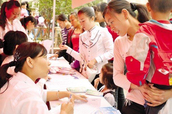 金秋时节,市妇幼保健院专门开展医疗卫生咨询活动,义务为妇女和儿童巡诊,宣传卫生知识,诊断疾病,深受百姓欢迎。(本报记者 陈德友 摄)