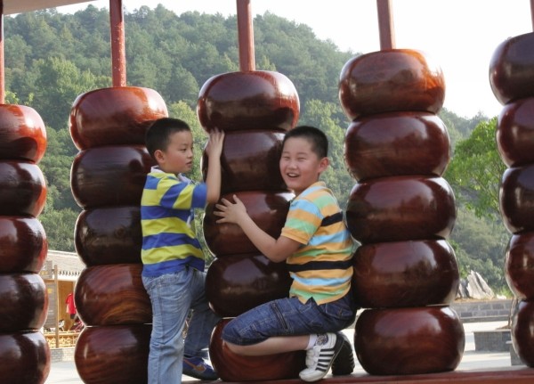 有“儒商第一村”之称的江西婺源思溪延村门口,矗立着一巨大的算盘,成为城里来的小学生的玩具(图1);