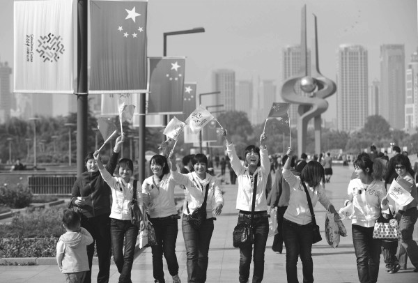 10月14日,一群来自山东泰安的青年在济南市泉城广场上挥舞着国旗和全运会会旗。第十一届全国运动会将于10月16日在济南开幕,济南市区处处可见盛会前的喜庆气氛。 (新华社发)