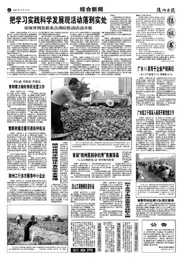 本报讯 记者祁鑫韧报道:10月14日,市委常委、市纪委书记肖伏清一行到随县柳林镇,了解该镇学习实践科学发展观及新农村建设情况。他要求把学习实践科学发展观活动落到实处,加快新农村建设步伐,