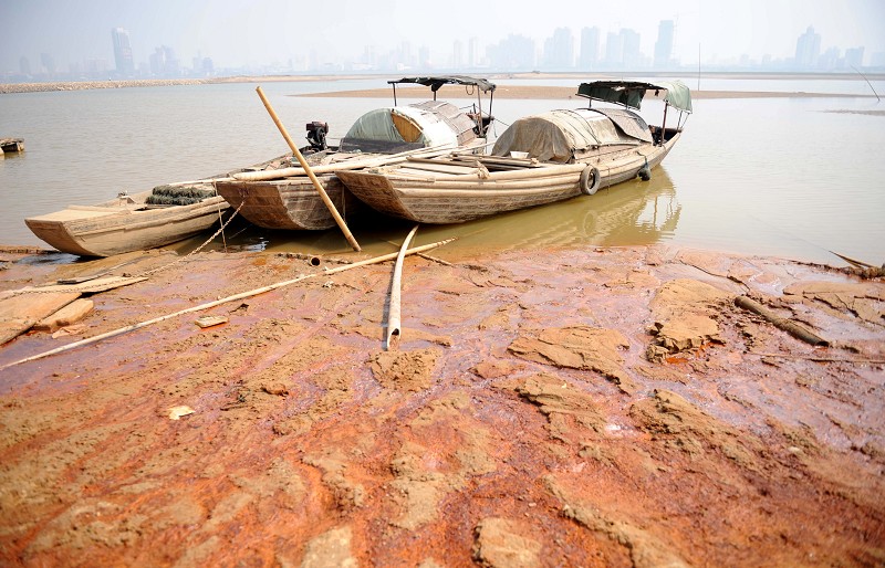 今年9月份以来,持续的久旱少雨导致赣江水位继续下降,据南昌水文站观测,10月17日,赣江南昌站水位下降到13.42米,比历史最低水位(13.55米)还低0.13米。图为几条渔船停靠在赣江南昌段几近干涸的河面上。