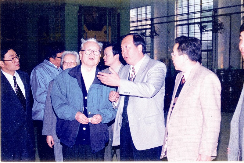 ▲1998年5月,原第一机械工业部部长周子建(左二)、在时任随州市市长吴超(左一)陪同下来厂视察工作。