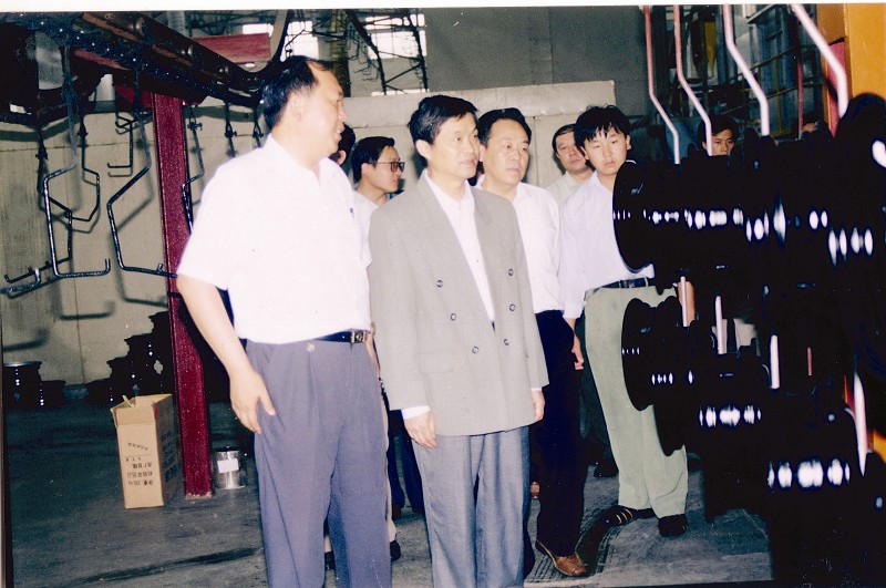 ◆1997年5月,时任省委常委、组织部长黄远志 (左二)在时任随州市委书记蒋昌忠陪同下来厂视察工作。