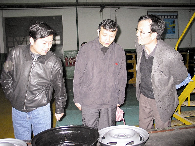 ◆2004年3月零部件事业部党委书记、车轮公司董事长何伟 (左一)到工厂检查工作。