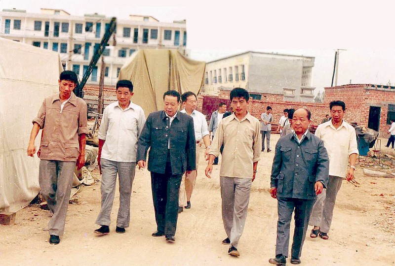 ▲1989年元月,东风汽车联营公司副董事长李惠民(左三)来厂考察。