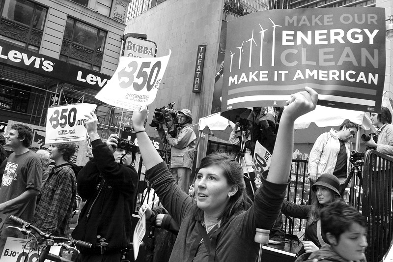 10月24日,在美国纽约时报广场,人们手举标语参加“国际气候行动日”群众集会。当天不少国家和地区开展了相关活动,呼吁人们关注气候变化。 (新华社发)