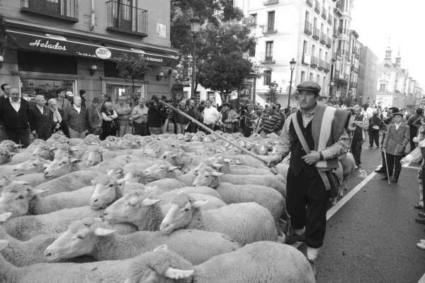 10月25日,几名牧民赶着绵羊穿过西班牙首都马德里城区。当天,牧羊人驱赶着300多只绵羊穿过马德里闹市区,希望引起政府对牧业的重视,要求古老的游牧路线得到保护。 (新华社发)
