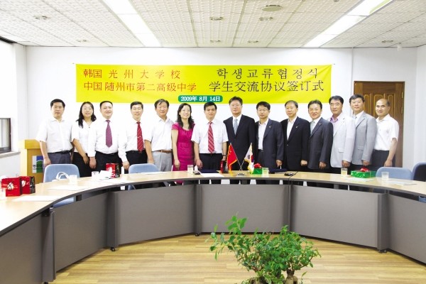 市委副书记冯仲凯(左七)参加随州二中与韩国光州大学学生交流协议签字仪式。