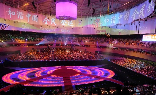 经过12天的鏖战,第十一届全运会昨晚将在山东济南落幕。据介绍,本届全运会共有10900多名运动员参加了决赛,是历届全运会参赛运动员最多的一届。在全部46个代表团中,有32个代表团获得了金牌,35个代表团获得了奖牌。共有7人9次创超5项世界纪录,3队12人21次创16项亚洲纪录,5队29人52次创39项全国纪录,5人12次创8项全国青年纪录。湖北省代表队以12金7.5银15铜总奖牌数34.5的成绩位列奖牌榜第15位。图为闭幕式现场。