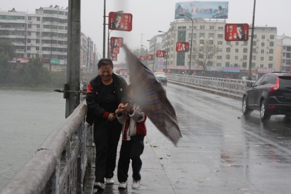 昨日,气温骤降,伴随大风大雨,让人真切感受到“风云突变”。图为一对母子风雨中行走在一桥上。(本报记者 杨闻名 摄)