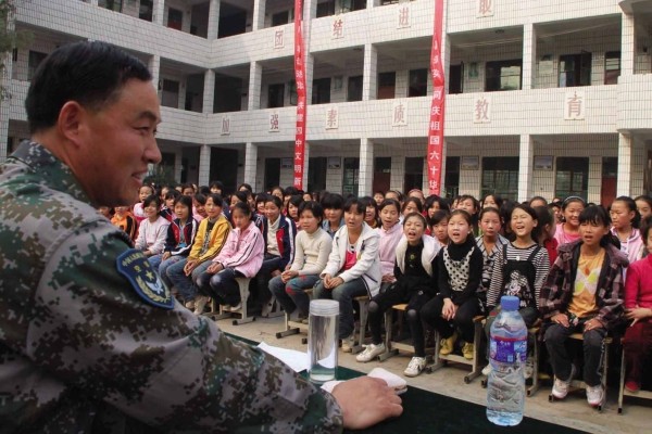 10月下旬,驻广水空降兵某部在参加“空降机动—2009”战役机动演练过程中,继承光荣传统,紧紧抓住有利时机,与地方政府、人民群众进行广泛深入的互动交流,做到“走一路、红一线,驻一地、红一片”,不断开阔视野,增强机动演练的政治价值和社会效益。图为部队首长正在对学生进行国防教育。