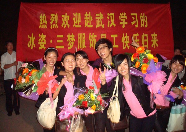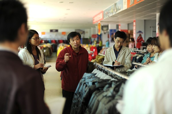 “八小时内求生存,八小时外求发展”。冰姿公司总经理韩继雄(左三)将新招的大学生带到公司直营店,亲自为他们上“做人与做事”辩证关系的人生哲理课。请进来,走出去,让员工不断“充电”,已成为该公司的一种制度。