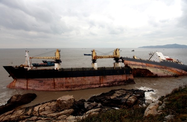 在触礁后断为两截的伊朗籍货船祖立克轮船周围,4日已经建起两道重型围油栏,已经回收油污水和油污块30多吨。据悉,11月1日在浙江舟山触礁的伊朗籍杂货船,船上500吨燃油存在外泄危险。 (新华社发)