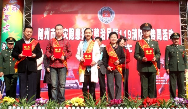 11月5日,在全市“火灾隐患排查整治月暨119消防宣传周”活动启动仪式上,5名来自不同行业优秀消防志愿者代表聘为随州市“119”消防宣传形象大使。 (本报记者 杨闻名摄)