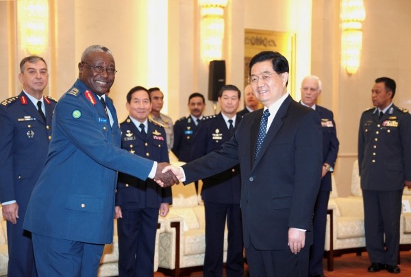 11月6日,国家主席、中央军委主席胡锦涛会见应邀前来参加中国人民解放军空军成立60周年“和平与发展国际论坛”的巴基斯坦等30国空军代表团团长。胡锦涛强调,中国将继续秉持和平、发展、合作的理念,坚持和平开发利用空天,积极参与国际空天安全合作,推动建设互利共赢、安全和谐的空天环境。 (新华社发)