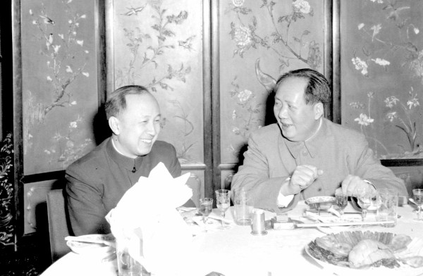 1956年2月,毛泽东同志和钱学森同志在中国人民政治协商会议全国委员会于中南海怀仁堂举行的宴会上交谈。 (新华社发)