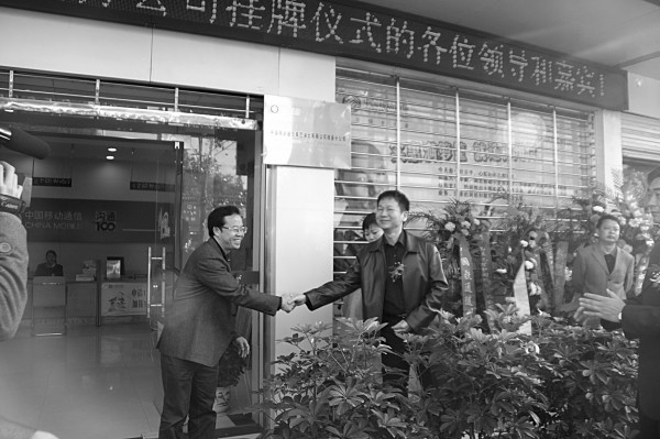 中国移动随州分公司总经理侯荆州(右)、随县人民政府筹备组组长陈德贵(左)为中国移动随县分公司揭牌。