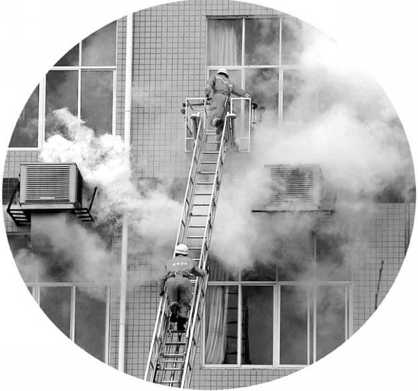 图为“火灾”发生后,迅速赶来的消防官兵登上云梯,营救被困工人。
