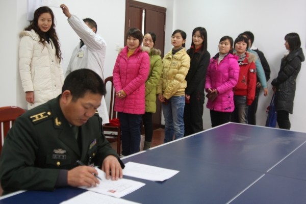 11月12日,曾都区人武部办公大厅内,前来应征的女青年在等候体检。据悉,今冬全市18-24岁报名参军的的适龄女青年达300余人,大专以上文化程度占70%,大学本科达150多人。 (本报记者 杨闻名 通讯员 裴作明摄)