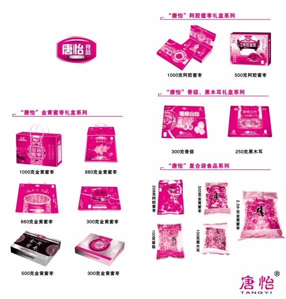 公司主导产品是“唐怡”牌金黄蜜枣,其中,金黄蜜枣个大肉丰,形体均匀,以“色泽金黄、体肥肉厚、甜如甘饴、沙酥爽口、营养丰富”而闻名,阿胶蜂蜜枣以纯天然罗汗枣、优质枣花蜂蜜、车阿阿胶为主要原料,具有补血、滋润、润燥、养胃等功效,是健身滋补之珍品和往来馈赠之佳品。
